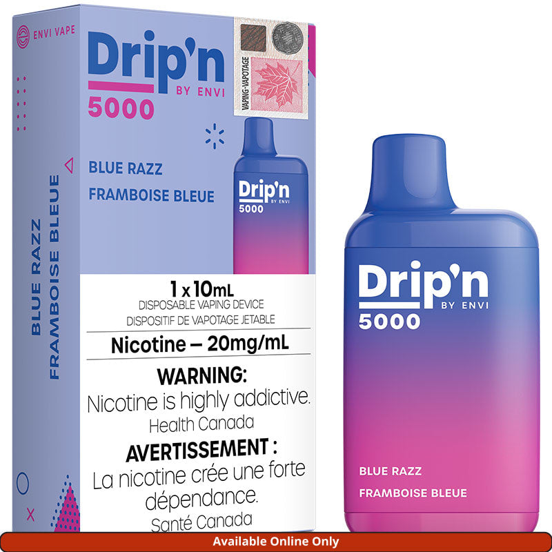 Marvel in handfuls of plump blueberries and tangy raspberries with the Blue Razz flavour Drip'n 5000 disposable vape by Envi, delivering up to 5000 puffs of delicious vapor with intuitive draw activation and airflow control using 10mL of pre-filled e-liquid containing 20mg/mL of nic salts and a 1.2Ω mesh coil powered by a 650mAh rechargeable battery.