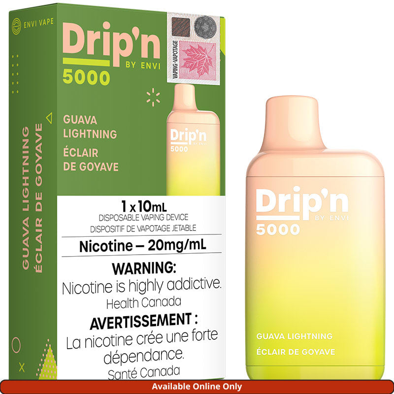 A powerful guava fruit juice that will get you through the day with the Guava Lightning flavour Drip'n 5000 disposable vape by Envi, delivering up to 5000 puffs of delicious vapor with intuitive draw activation and airflow control using 10mL of pre-filled e-liquid containing 20mg/mL of nic salts and a 1.2Ω mesh coil powered by a 650mAh rechargeable battery.