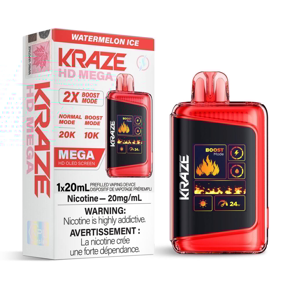 Watermelon Ice Kraze HD Mega Disposable Vape is a frosty explosion of sweet, juicy watermelon, delivering a cool, refreshing delight that quenches your flavor thirst.